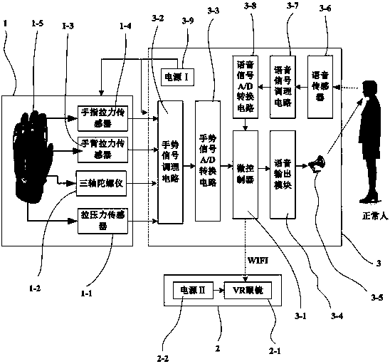 - 项目简介 一种聋哑人与正常人双向交流的穿戴式设备,属于语言识别设备技术领域。由聋哑人手套、VR眼镜模块和控制模块组成;每只手套至少包含一个安装在手套腕部的拉压力传感器、一个安装在手套背部的三轴陀螺仪和一个手背拉力传感器、安装在手套每个手指外侧的手指拉力传感器;控制模块由微控制器、手势信号调理电路、手势信号A/D转换电路、语音输出模块、喇叭、语音传感器、语音信号调理电路、语音信号A/D转换电路和电源Ⅰ组成;VR眼镜模块由VR眼镜和电源Ⅱ组成。聋哑人可将手势信息以语音形式传给对方的正常人,不需要借助任何设备就可将语音传给对方的聋哑人,实现聋哑人与正常人的无障碍双向交流;聋哑人也可以“听到”电子产品的语音。