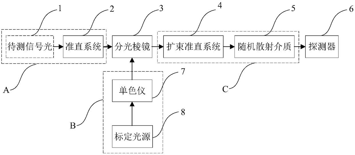 - 项目简介 本发明涉及一种基于散射原理的光谱测量系统及方法。该系统包括:待测支路A、标定支路B、分光棱镜3、散射编码分系统C、探测器6;所述待测支路A与所述标定支路B均与所述分光棱镜3连接,所述分光棱镜3、所述散射编码分系统C及所述探测器6依次串行连接。本发明实施例避免了多次扫描或动镜驱动等,仅需要一次标定过程即可以完成不同信号光光谱测量,通过选择合适散射平均自由程的散射介质,系统的光谱分辨率可以在不增加系统复杂度等前提下最大限度提高。此外,本发明提出的光谱测量系统所需原件成本较低、结构简单且抗扰动能力强。