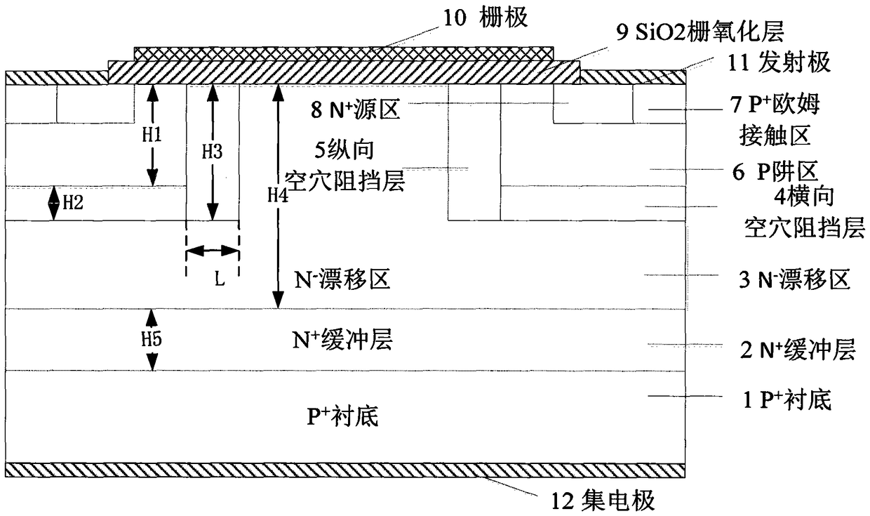 - 项目简介 本发明实施例提供了一种低导通电阻的SiC IGBT及其制备方法,涉及高压功率半导体器件技术领域,可以提高漂移区电导,可以降低器件的导通压降和导通电阻,从而减小正向导通功耗。所述碳化硅绝缘栅双极型晶体管包括:P+衬底(1),N+缓冲层(2),N‑漂移区(3),N+空穴阻挡层(4),N+空穴阻挡层(5),P阱区(6),P+欧姆接触区(7),N+源区(8),SiO2栅氧化层(9),栅极(10),发射极(11),集电极(12),P阱区(6)与N‑漂移区(3)之间设置有横向N+空穴阻挡层(4)和纵向N+空穴阻挡层(5),P阱区(6)和N+空穴阻挡层(4)和(5)均为恒定掺杂。