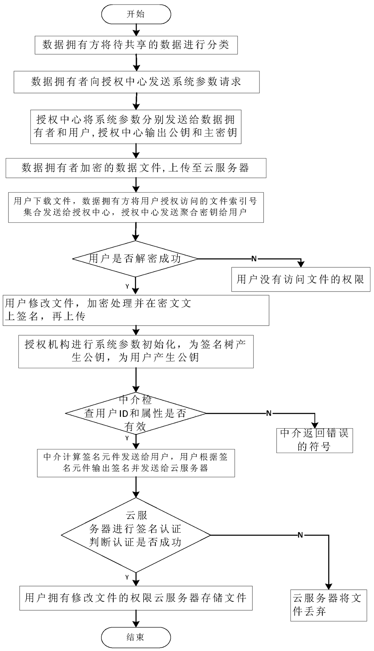 - 项目简介 本发明公开了一种基于数据共享的文件访问和修改权限控制方法,主要解决现有技术访问效率低,计算复杂,不适用于用户修改文件的问题。其实现步骤包括:1.数据拥有方将数据文件按照属性进行分类处理,并加密上传;2.用户根据自己的需要访问分类文件,云服务器返回相应的文件给用户;3.授权中心合成聚合密钥传输给用户,用户使用该聚合密钥解密密文文件;4.用户对访问文件进行修改,将修改后的文件进行加密,附上签名并上传;5.云服务器对该用户进行基于属性的签名认证,若认证成功,则存储该文件,否则,丢弃该文件。本发明具有读写性能及效率高,计算复杂度低、存储可靠的优点,可用于云计算环境中基于隐私保护的数据共享和访问控制。