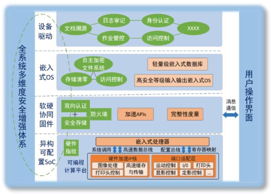 通过自主异构可配置SoC、软硬协同固件、设备安全增强体系、软件定义总线的网络化互联等创新设计,创造性地提出了输入输出设备统一框架, 覆盖了黑白/彩色、扫描/打印/复印全系列设备功能需求,为高性能自主可控输入输出设备研制和产业化提供了统一解决途径和方案。