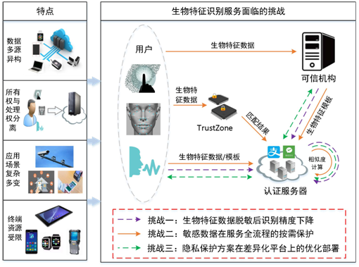 按“需求分析、特性提取、柔性组合、分层保护”的技术思路,基于形式化描述、频繁项集挖掘、组合优化等方法,提出服务信息形式化描述方法和面向生物特征识别服务全流程的数据安全脱敏框架,突破服务模式多维度刻画、隐私保护算法特性分析、安全保护机制最优组合等关键技术, 解决差异化服务模式自适应的安全框架构建和涵盖服务全流程特征数据全脱敏等技术难点。