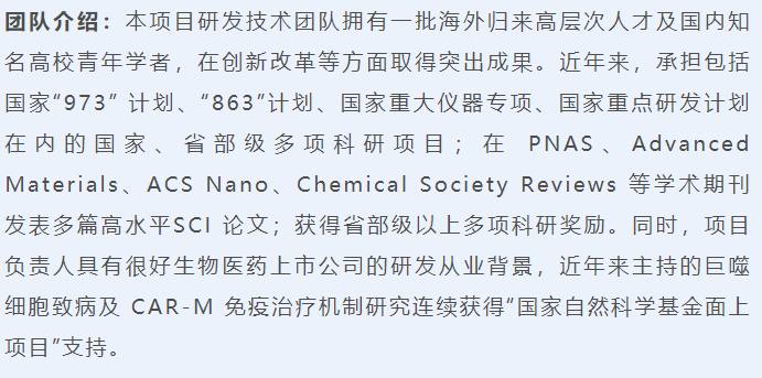 目前国内外研发团队正在积极寻找更佳的细胞免疫治疗产品,当前仍需开拓更完美更适宜的细胞免疫治疗技术平台以攻克实体肿瘤。显然,本项目的 CAR-巨噬的技术开发既传承了经典 CAR-T 的研发优势,又实现了诸多基于巨噬细胞生物特性的创新和发展,将很有潜力成为下一个伟大的细胞免疫疗法新锐,早日在实体瘤领域取得突破!
