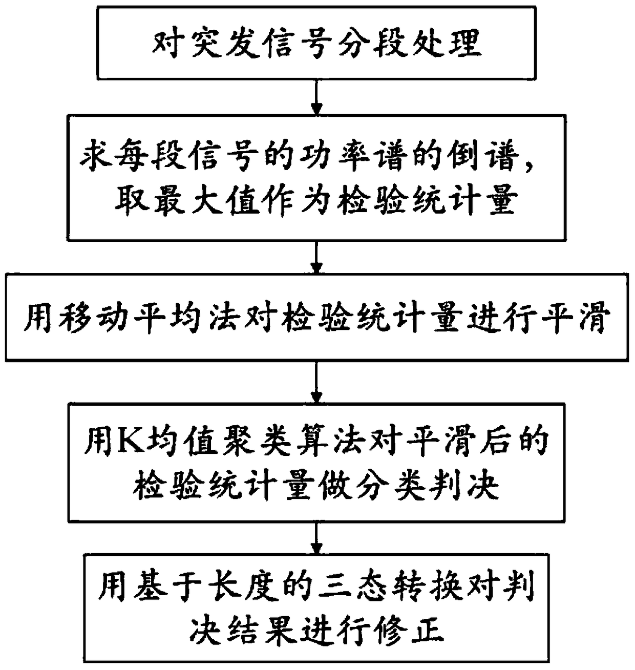 - 项目简介 本发明公开了一种低信噪比下突发信号的检测方法,包括以下步骤:对接收到的突发信号进行分段处理,再求每段信号的功率谱的倒谱,取其倒谱的最大值作为检验统计量;用移动平均法对检验统计量进行平滑,再用K‑均值聚类算法对其分类判决,区分出信号和噪声;用基于长度的三态转换对判决结果进行修正,完成突发信号的检测。本发明可以对低信噪比环境下的突发信号具有较好的检测性能。