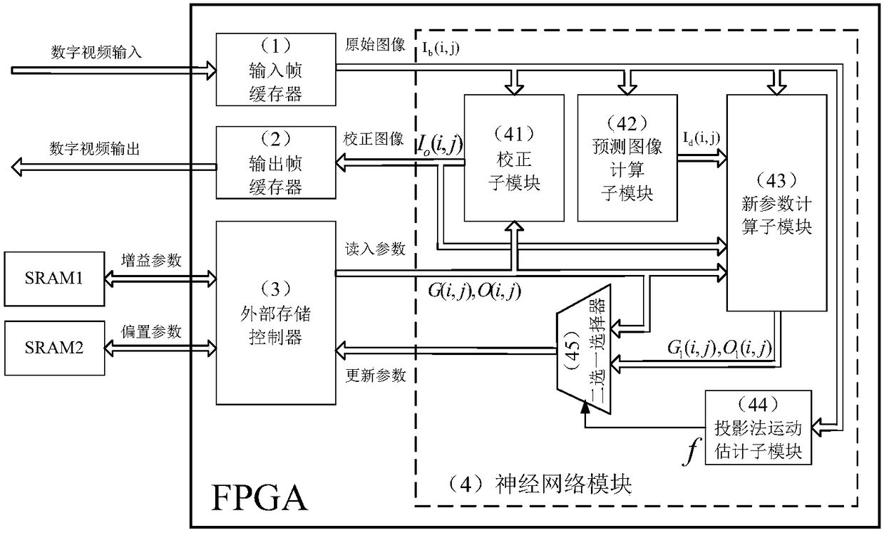 - 项目简介 本发明公开了一种基于FPGA的红外成像非均匀性校正系统。其包括:输入帧缓存器(1)、输出帧缓存器(2)、外部存储控制器(3)和神经网络模块(4);该神经网络模块(4)包括:校正子模块、预测图像计算子模块、新参数计算子模块、投影法运动估计子模块和二选一选择器。输入帧缓存器接收并缓存原始图像;外部存储控制器读入校正参数;校正子模块校正原始图像并通过输出帧缓存器缓存;预测图像计算子模块计算预测图像并通过新参数计算子模块计算新校正参数;投影法运动估计模块和二选一选择器选择参数更新,以校正下一帧原始图像。本发明解决现有技术中的“鬼影”和图像模糊问题,可用于实时校正红外图像的非均匀性。