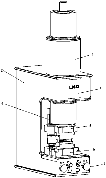 - 项目简介 本发明涉及一种筒型定子永磁直线电机驱动高速压力机,至少包括定子永磁直线电机、箱体、触摸屏控制器、光栅位移传感器组件、上模、下模、开关按钮面板、直线电机驱动器;箱体包括上壳体和下壳体;定子永磁直线电机固定在箱体的上壳体顶部,使定子永磁直线电机的电机轴杆垂直向下,电机轴杆固定上模;箱体的下壳体上部固定下模;驱动定子永磁直线电机带动上模上下往复移动与下模合模和开模;完成对冲压件冲压工艺;触摸屏控制器用于人机交互控制指令发送和压力机状态数据监控;光栅位移传感器组件用于测量反馈上模的位置信号;直线电机驱动器用于定子永磁直线电机的驱动控制,开关按钮面板用于所述触摸屏控制器和直线电机驱动器的电源开关控制。