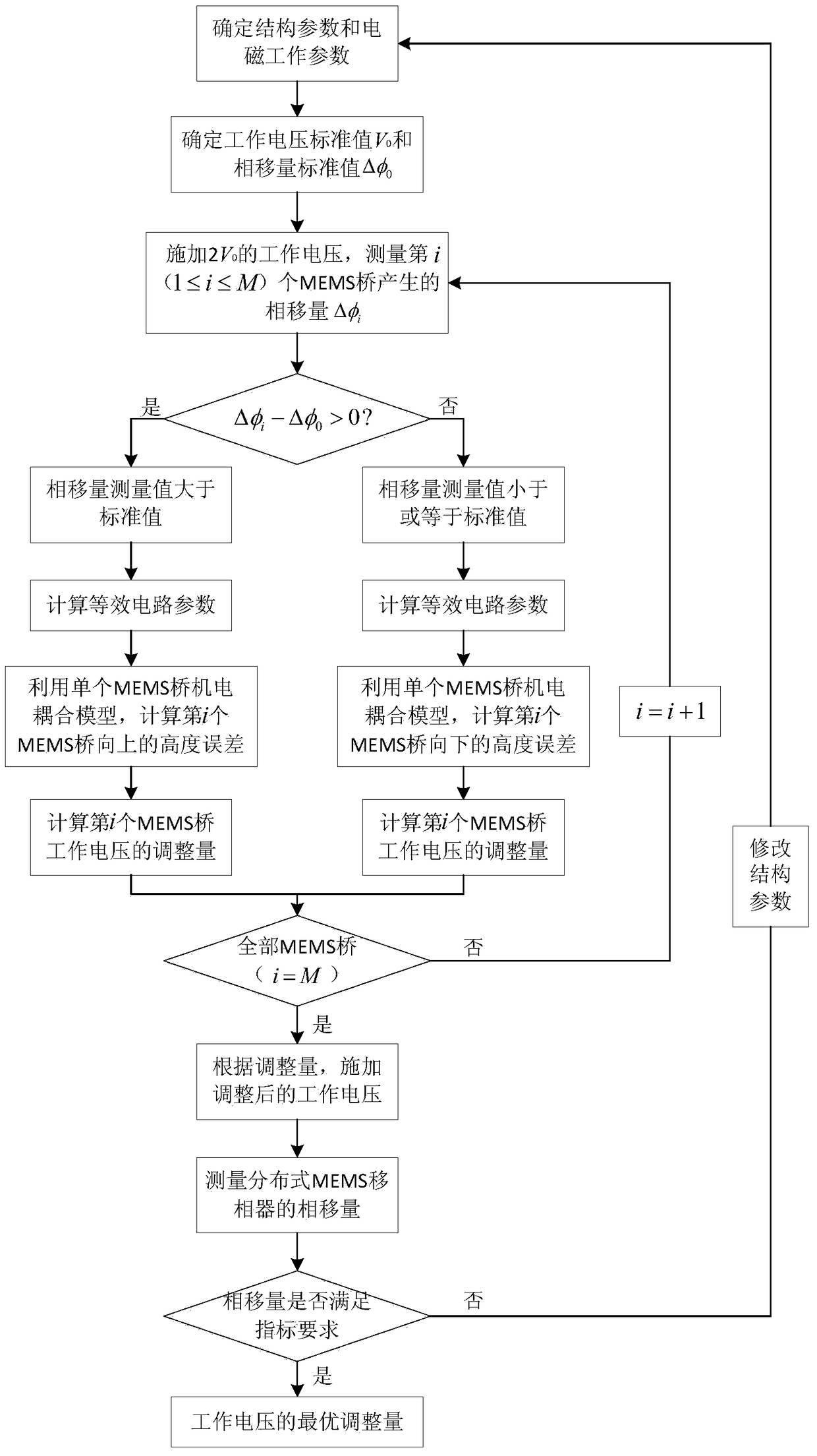 - 项目简介 本发明公开了一种基于相移量机电耦合的分布式MEMS移相器工作电压的调整方法,包括确定分布式MEMS移相器的结构参数、材料属性和电磁工作参数;确定工作电压标准值V0和相移量标准值Δφ0;施加2V0的工作电压,测量M个MEMS桥中相移量Δφi;比较相移量测量值Δφi与标准值Δφ0;当相移量测量值Δφi>标准值Δφ0,得MEMS桥有向上的高度误差,计算等效电路参数和工作电压调整量;当相移量测量值Δφi≤标准值Δφ0,得MEMS桥向下高度误差或无误差,计算等效电路参数和高度误差值,计算工作电压的调整量;判断是否已对全部计算工作电压调整量;重新施加到相应的MEMS桥上,测量分布式MEMS移相器的整体相移量;判断调整工作电压后的分布式MEMS移相器电性能是否满足指标要求。本方法为实际工作的可靠性提供了理论指导。