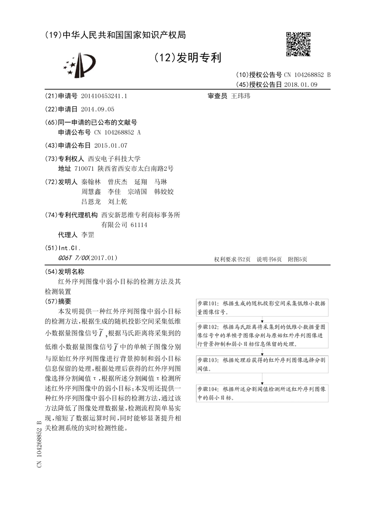 - 项目简介 本发明提供一种红外序列图像中弱小目标的检测方法,根据生成的随机投影空间采集低维小数据量图像信号根据马氏距离将采集到的低维小数据量图像信号中的单帧子图像分别与原始红外序列图像进行背景抑制和弱小目标信息保留的处理,根据处理后获得的红外序列图像选择分割阈值τ,根据所述分割阈值τ检测所述红外序列图像中的弱小目标;本发明还提供一种红外序列图像中弱小目标的检测方法,通过该方法降低了图像处理数据量,检测流程简单易实现,缩短了数据运算时间,同时能够显著提升相关检测系统的实时检测性能。