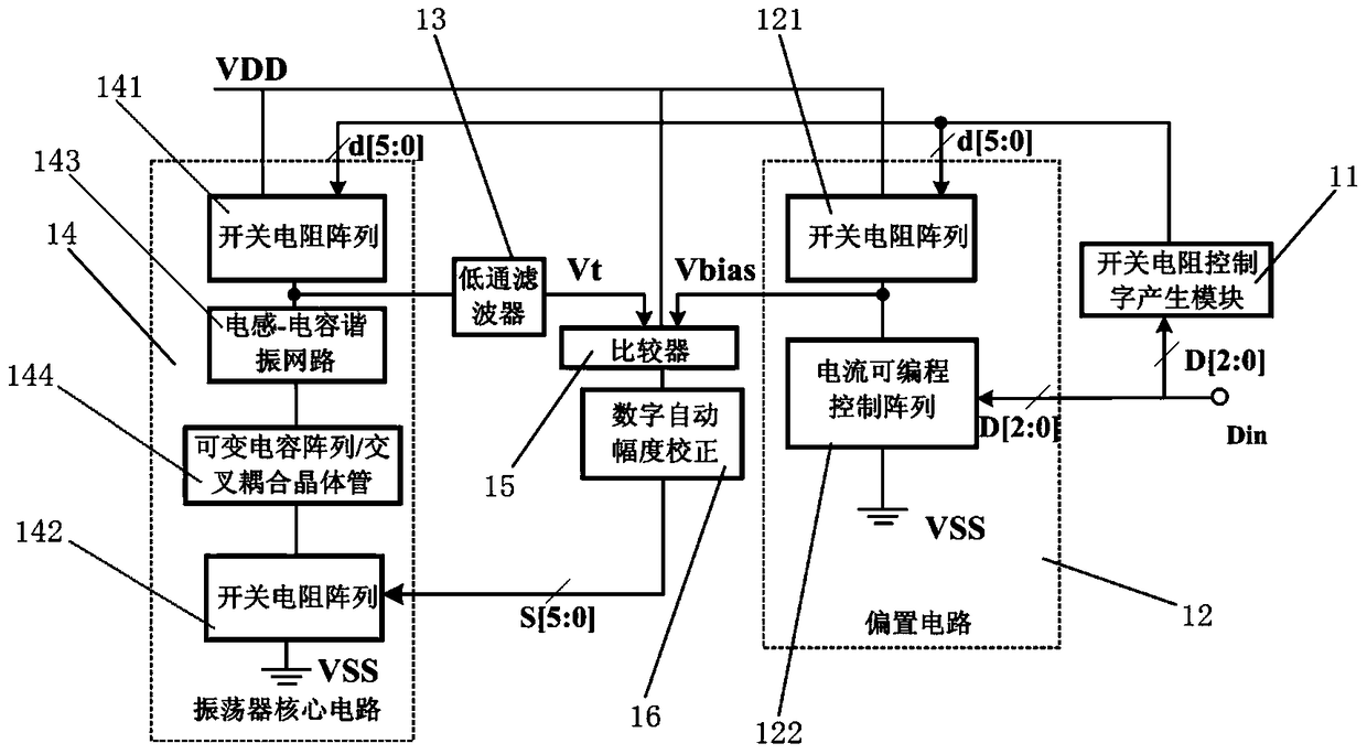 - 项目简介 本发明涉及一种输出摆幅自动校正LC压控振荡器,包括振荡器核心电路模块、低通滤波器、比较器、数字自动幅度校正模块、偏置电路模块以及开关电阻控制字产生模块;振荡器核心电路模块由第一开关电阻阵列、LC谐振网络、可变电容阵列/交叉耦合晶体管以及第二开关电阻阵列组成,偏置电路模块由第三开关阵列和电流可编程控制阵列组成。本发明采用开关电阻阵列代替传统的电流源阵列,降低了电路中的噪声对振荡器相位噪声的影响;采用偏置电路对振荡器输出摆幅的实时调节,采用低通滤波器、比较器和数字自动幅度校正模块构成输出幅度检测环路;输出信号幅度检测点选取在谐振网络与开关电阻阵列之间,降低了检测环路噪声对振荡器输出信号的影响。