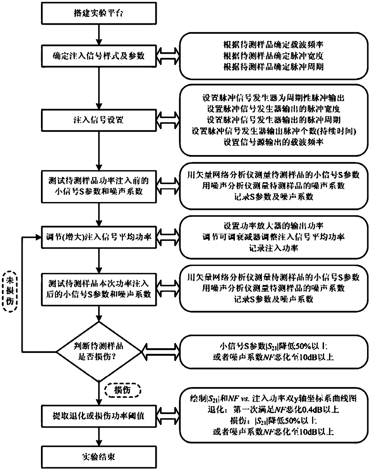 - 项目简介 本发明公开了一种测定低噪放退化功率阈值和损伤功率阈值的方法,其包括以下步骤:一、构建测试平台;二、构造注入信号:三、测试:(1)测量待测样品的小信号S参数|S21|和噪声系数NF,(2)对待测样品持续注入一定时间,(3)测量本次注入后待测样品的|S21|和NF,(4)增大注入信号平均功率,反复进行(2)和(3)两步,直到|S21|和NF发生剧烈恶化为止;四、绘制|S21|和NF随着注入功率Pin增大而变化的双y轴坐标系曲线图,从中提取退化功率阈值和损伤功率阈值。本发明的有益之处在于:功率注入效果更好,阈值测量结果更能反映出低噪放实际工作条件下的抗功率程度;可得到退化功率阈值,满足了低噪放高可靠性和用于高灵敏度电子设备中低噪声的要求。