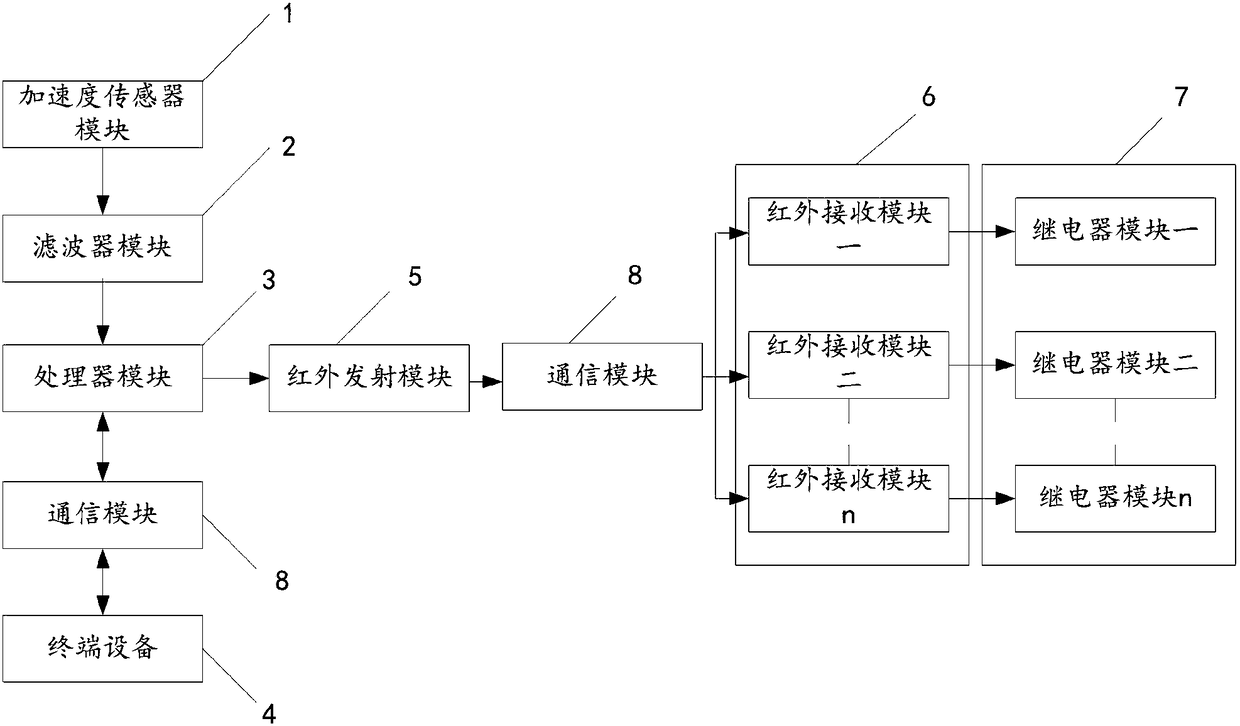 - 项目简介 本实用新型涉及信息技术领域,公开了一种基于加速度的手势识别系统,包括:加速度传感器模块、处理器模块、红外发射模块、多个红外接收模块、多个继电器模块和通信模块;加速度传感器模块和处理器模块连接,处理器模块通过红外发射模块和通信模块连接,通信模块与多个红外接收模块连接,多个红外接收模块与多个继电器模块一一对应连接,这种基于加速度的手势识别系统,能实现快速方便地对智能家居进行控制,使用方便。